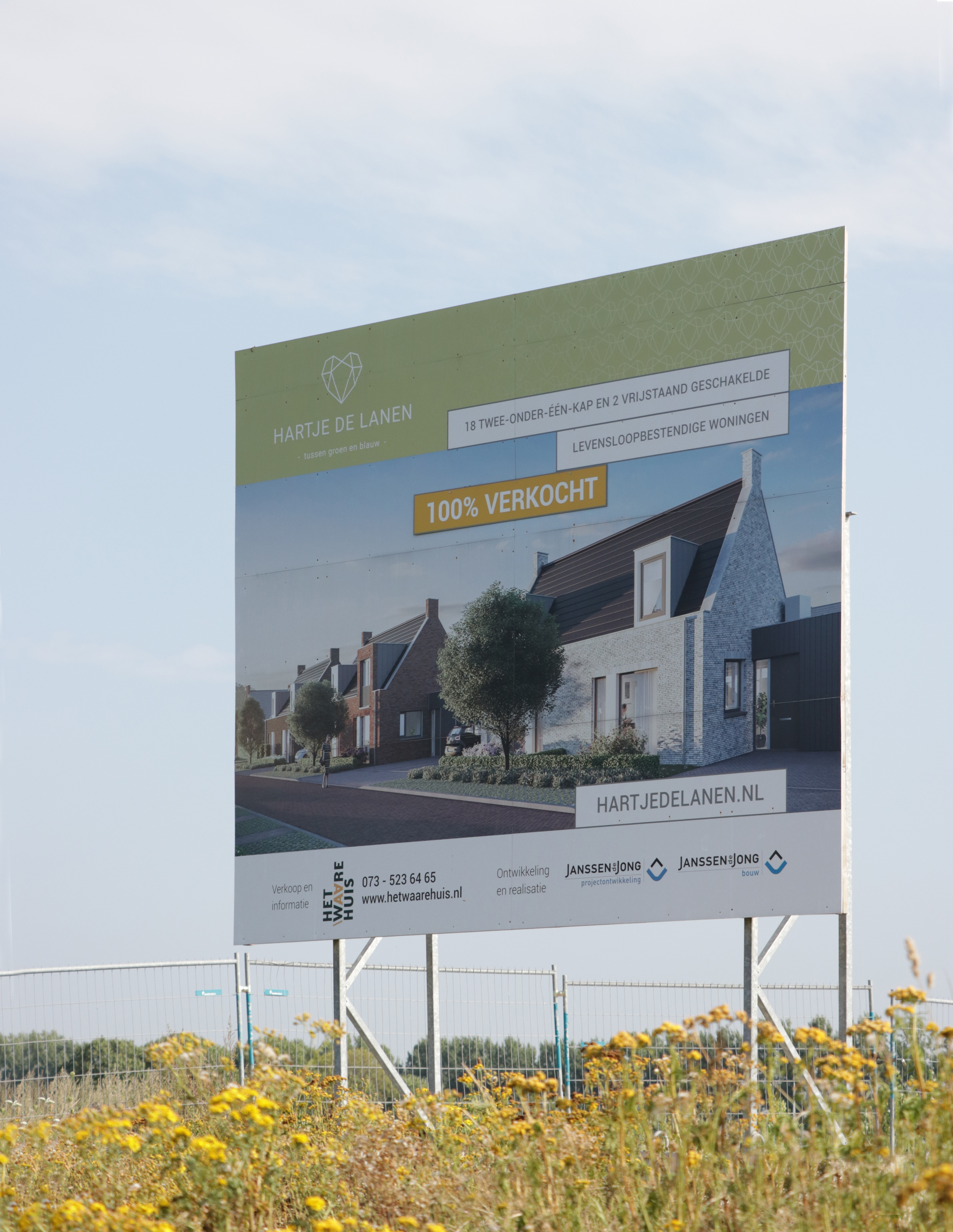 In opdracht van Janssen de Jong verzorgden we dit projectbord op een stalen draagconstructie. Behalve een fraaie verschijningsvorm ook economisch interessant, namelijk volledig te hergebruiken en uitermate stormbestendig.