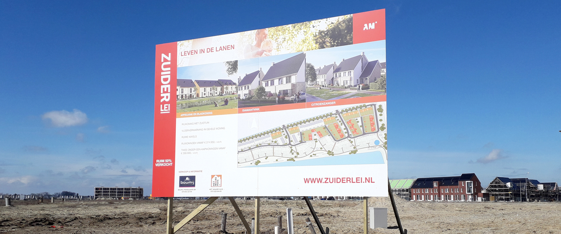 Voor de verkoop van het plan Zuiderlei te Rosmalen verzorgden wij voor ontwikkelaar AM een traditioneel projectbord en een transparante afbeelding van de website.